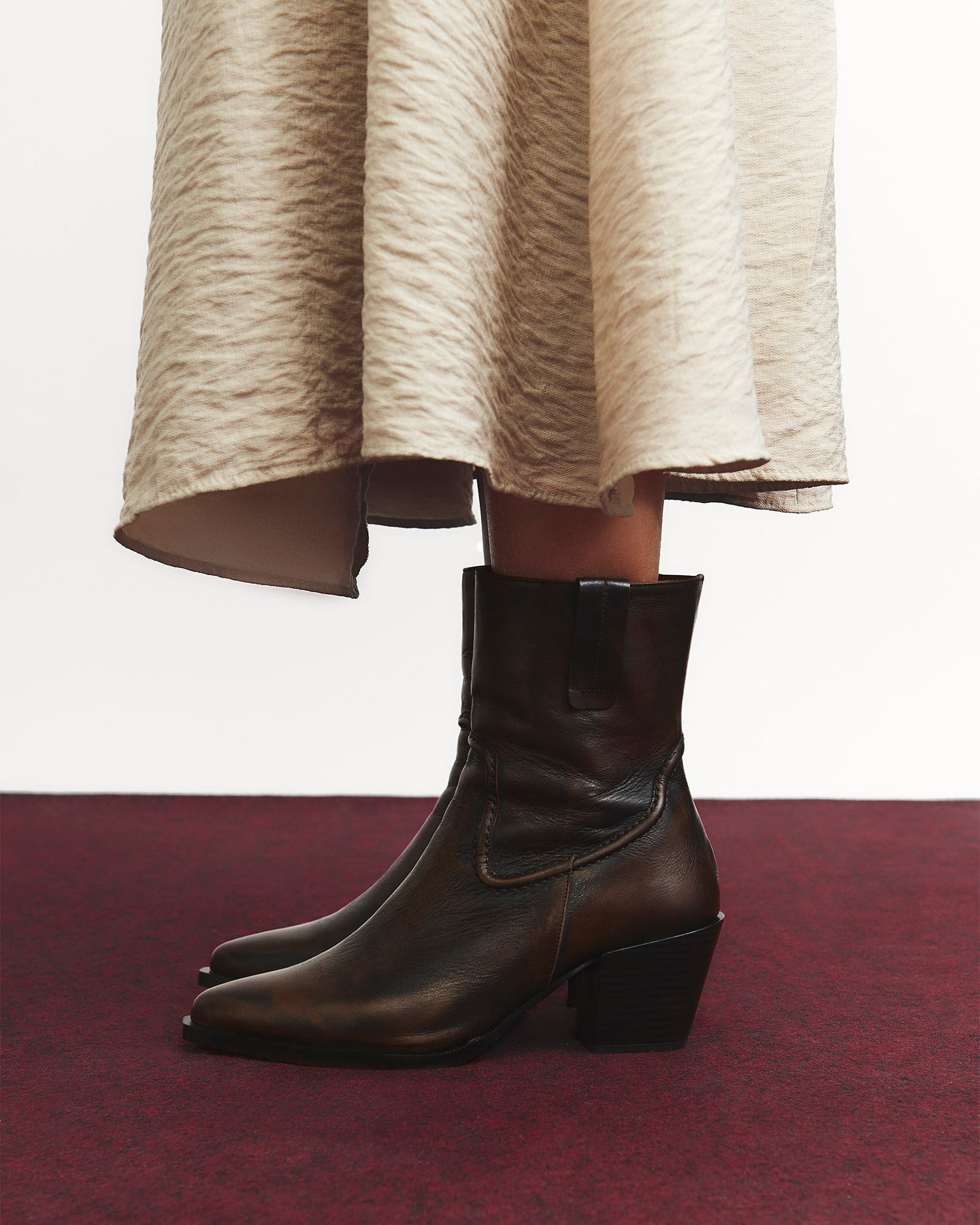 Der Egeria Boot vereint die Kühnheit des Westernstils mit müheloser Eleganz. Dieser Stiefel ist die ideale Wahl für Frauen, die Schuhe suchen, die Charakter und Handwerkskunst vereinen. Hergestellt aus edlem Mahagonileder mit dezentem Used-Look, der ihm Vintage-Charme und unverwechselbare Persönlichkeit verleiht. Die spitze Zehenpartie und der 6 cm hohe Blockabsatz bieten die perfekte Höhe, um Ihre Figur zu betonen, ohne auf Komfort zu verzichten. Die flexible Gummisohle sorgt für ein weiches und anpassungsfähiges Laufgefühl. Mit Obermaterial und Futter aus 100 % Leder ist der Egeria Boot die perfekte Ergänzung zu jedem Outfit, von lässig bis formell, und verleiht ihm einen Hauch von Geschichte und Vornehmheit. Handgefertigt in Spanien.