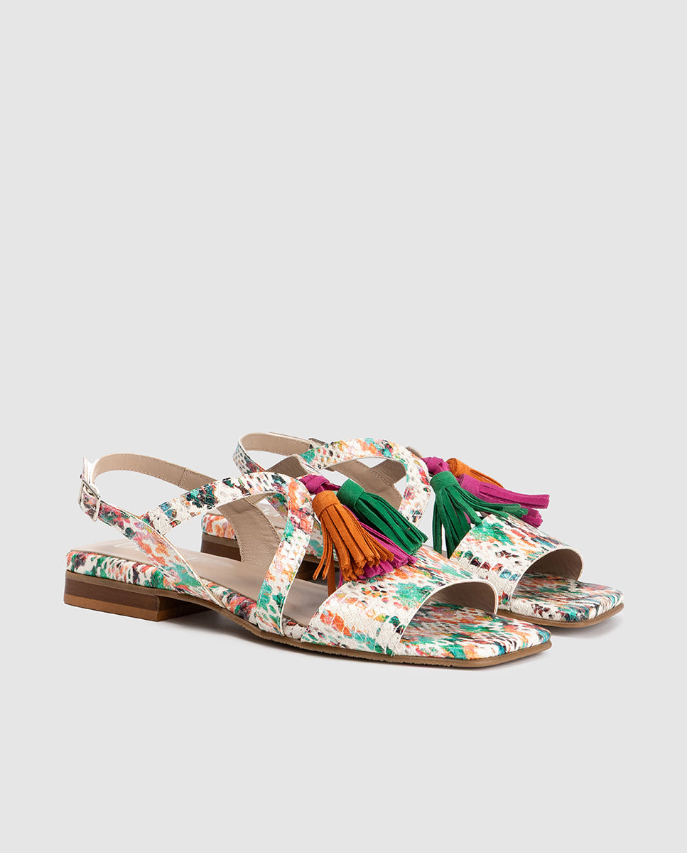 Dale la bienvenida al verano con el modelo Marie. Confeccionada en nuestra piel con estampado floral exclusivo, esta sandalia destaca por su diseño de tiras cruzadas que abrazan el pie con suavidad y sus icónicas borlas tricolor (fucsia, naranja y verde) que llenan de alegría cada paso. Su punta cuadrada le da ese toque de tendencia actual, mientras que su tacón bajo de 2 cm .