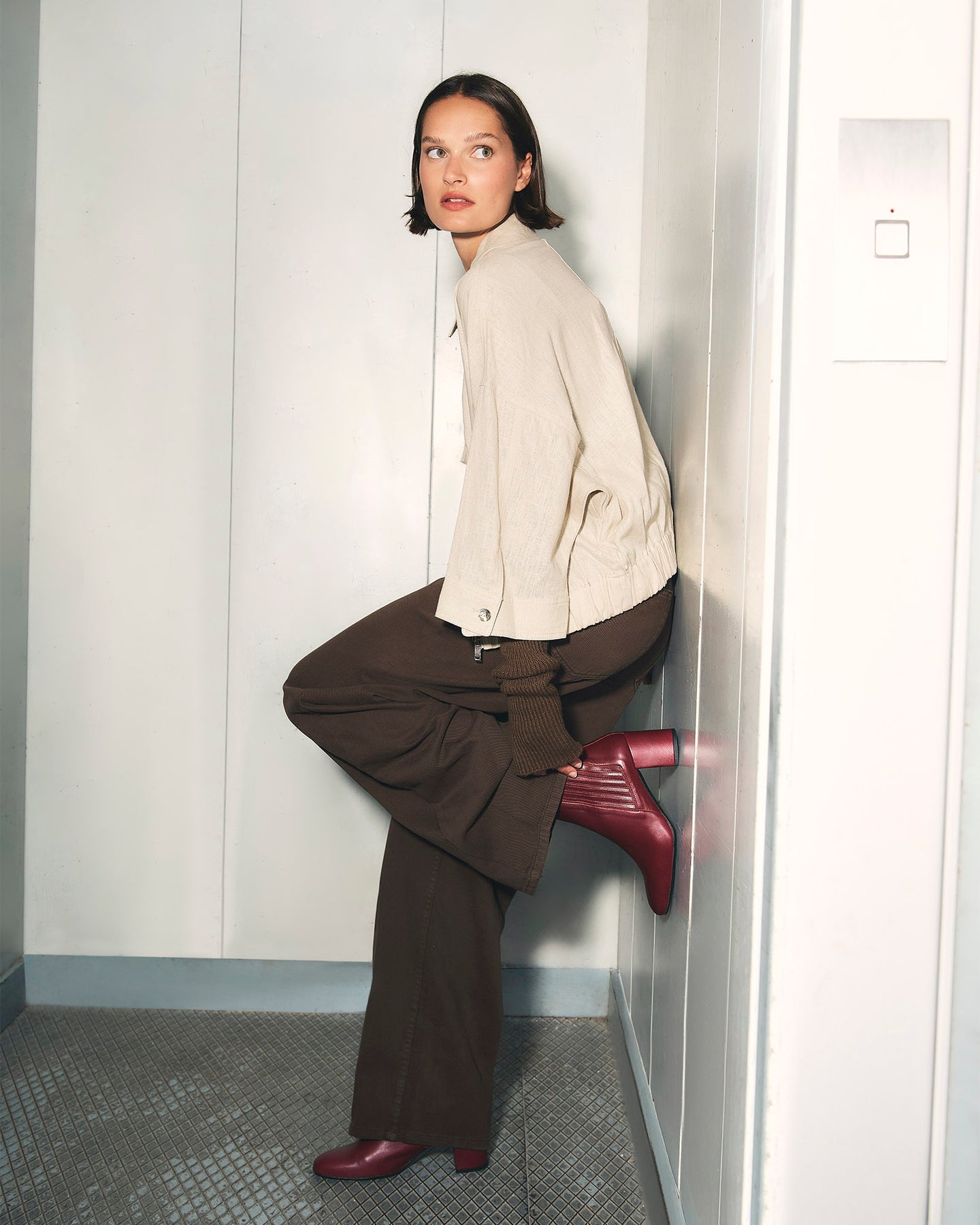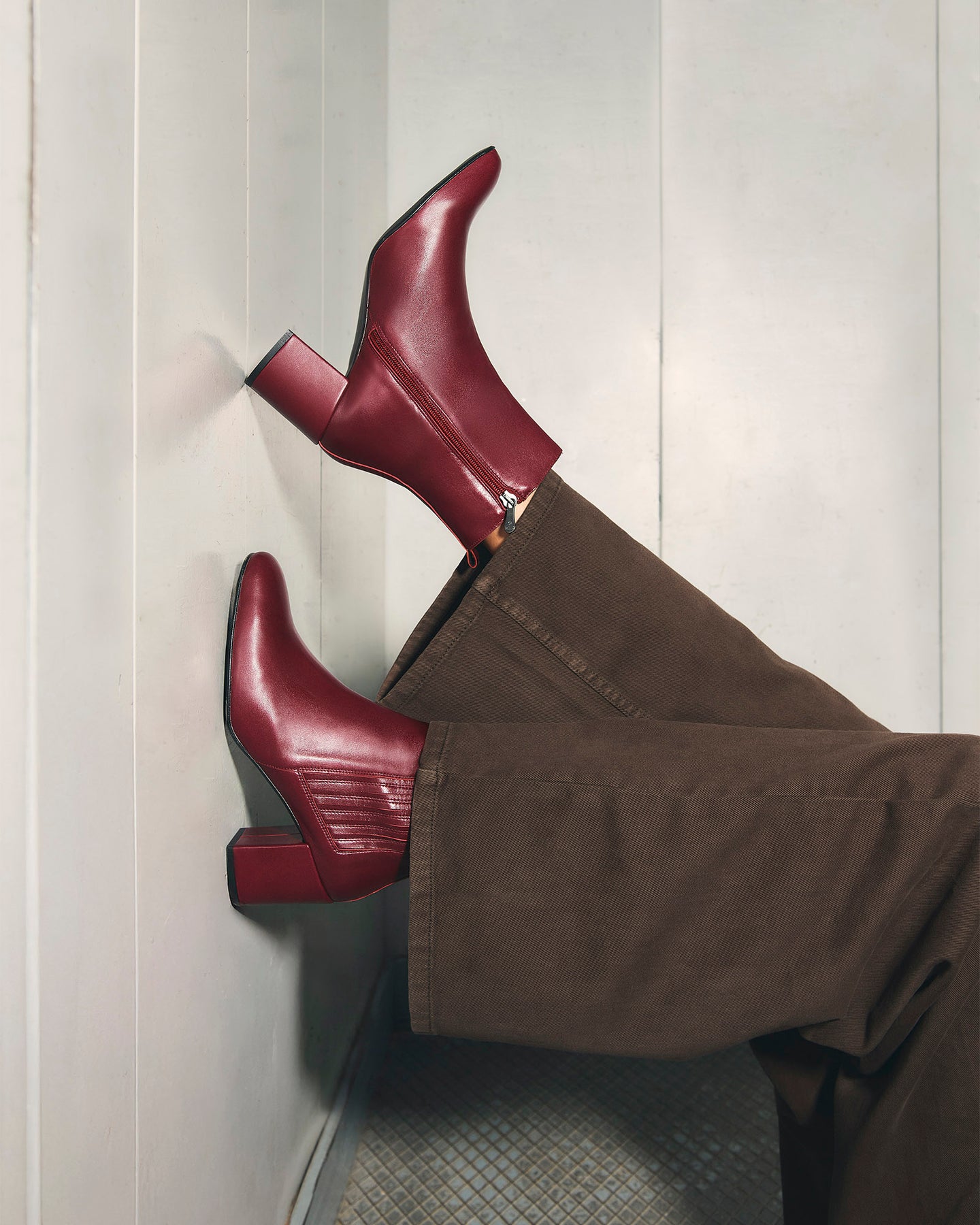 Altura tacón: 7 cm | Corte y forro: 100% piel | Suela: Caucho flexible | Material y color: Piel mestizo burdeos