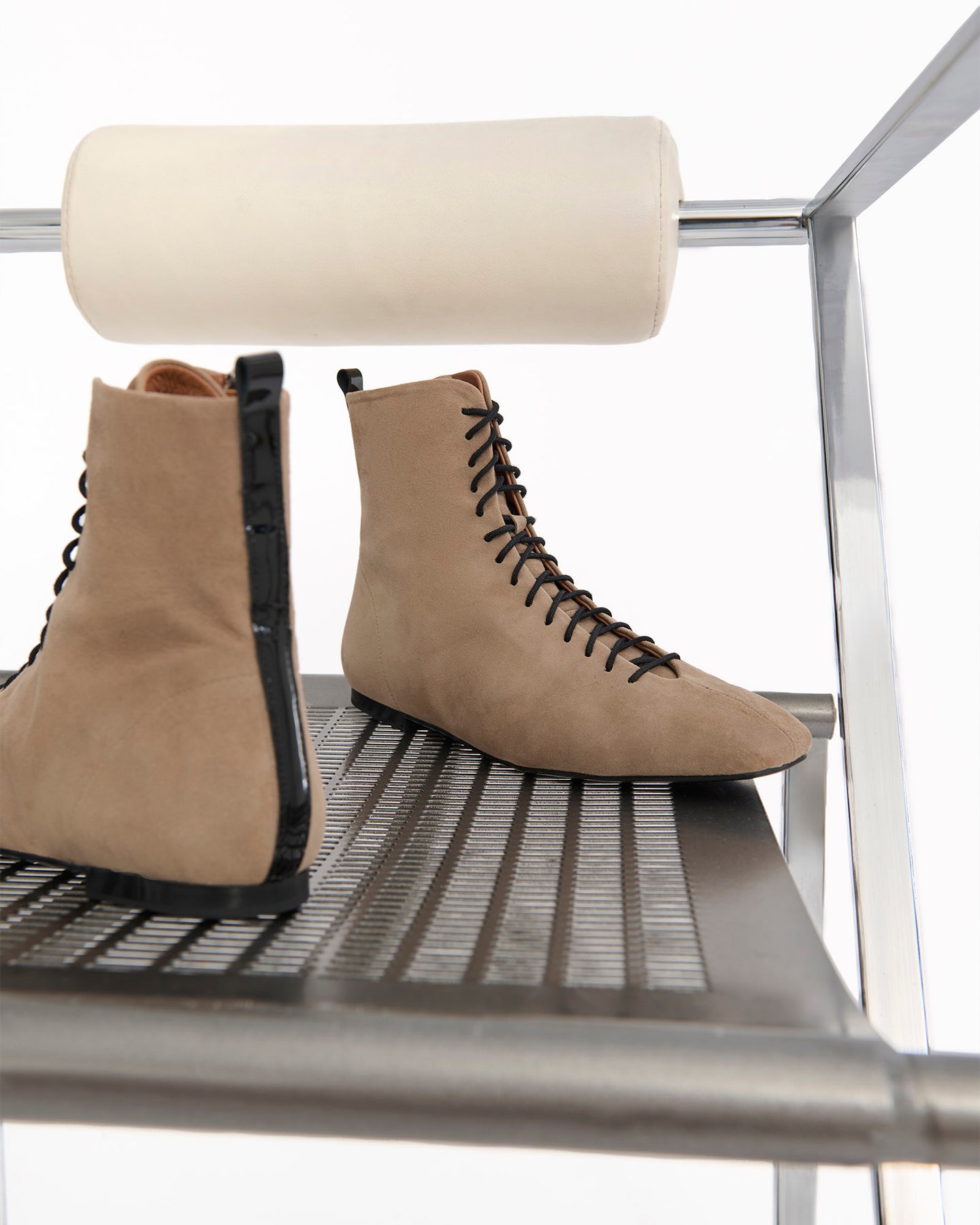 Botín plano con cordones es la elección perfecta para la mujer que busca un calzado versátil, cómodo y con carácter. Confeccionado en suave ante topo y acentuado por la tira del talón en charol negro para un contraste sutil y sofisticado. Su diseño de caña media con cordones asegura un ajuste perfecto y un estilo atemporal. Ideal para añadir un toque chic a tus looks casuales y sofisticados.